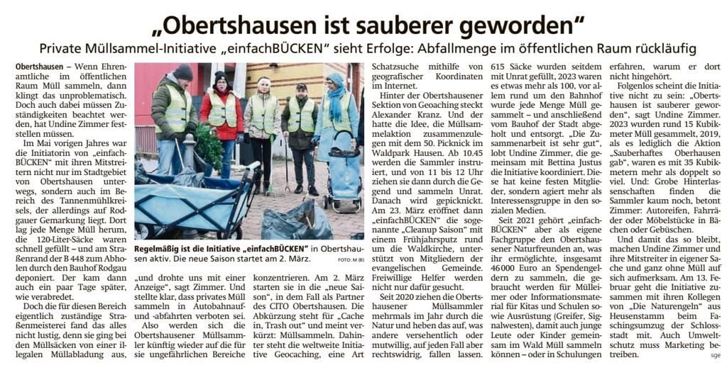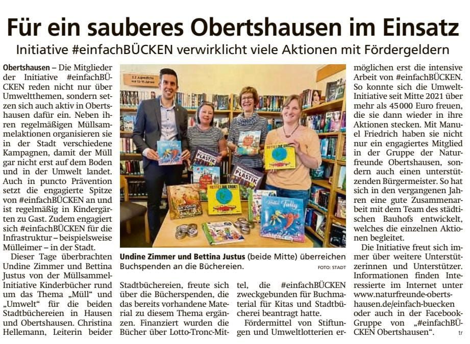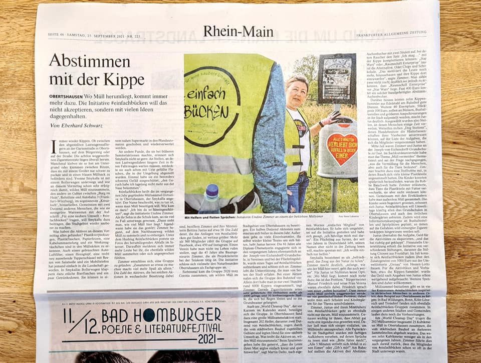 Viele Einzelpersonen haben sich bereits vor #einfachBÜCKEN in Obertshausen engagiert – aber seit dem Zusammenschluss in einer Gruppe im Januar 2020 können wir noch viel mehr erreichen! Im September 2020 wurde #einfachBÜCKEN als Fachgruppe bei den NaturFreunde Obertshausen e.V. aufgenommen. Im ersten Jahr haben wir es - trotz den Corona Beschränkungen - geschafft, 7 gemeinsame Sammelaktionen an verschiedenen Punkten im Ort durchzuführen, mit jeweils mehr als 50 Teilnehmern.