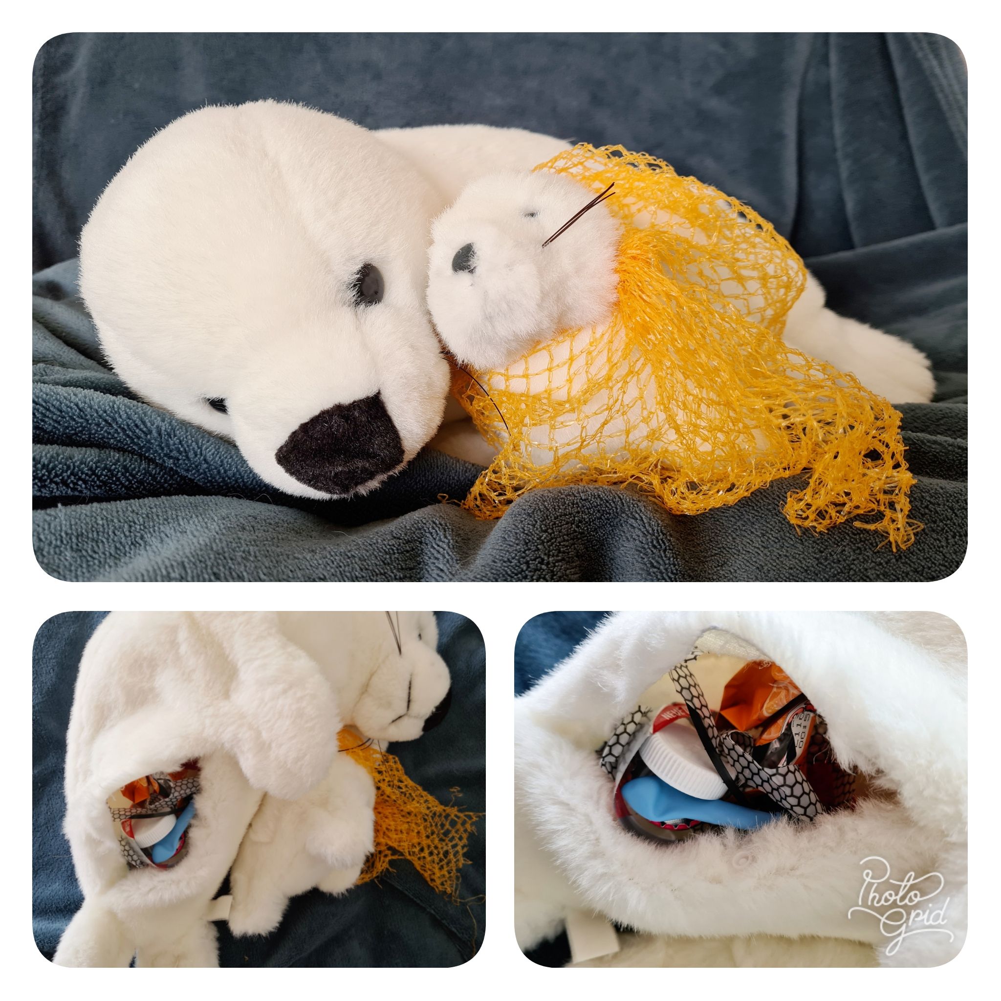 Ein besonderes Highlight für die Kinder war unsere Lina und ihr Baby, eine Stoff-Robben-Mama, die das #einfachBÜCKEN Team im Vorfeld prepariert hatte. Das Baby hatte sich in einem Fischernetz verfangen und die Mama hatte starke Bauchweh. Fachkundige Schüler*innen mit dem Berufswunsch Tierarzt/Tierärztin haben Lina intensiv untersucht und festgestellt, dass der Bauch sich mit Plastikmüll gefüllt hat. Dank Druckknöpfen konnte der Eingriff direkt im Klassenraum vorgenommen und der Müll aus dem Bauch gefördert werden. Mit großen Augen wurden der Müll begutachtet und einstimmig befunden, dass wir alle etwas gegen den Müll in der Natur und im Meer unternehmen müssen! Mission erfüllt 😊